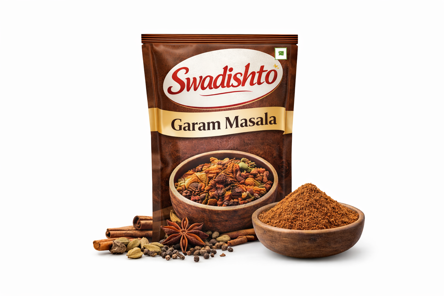 Swadishto Garam Masala ek special blend hai jo traditional Indian spices se bana hai. Har dish me rich taste aur aroma add karta hai.